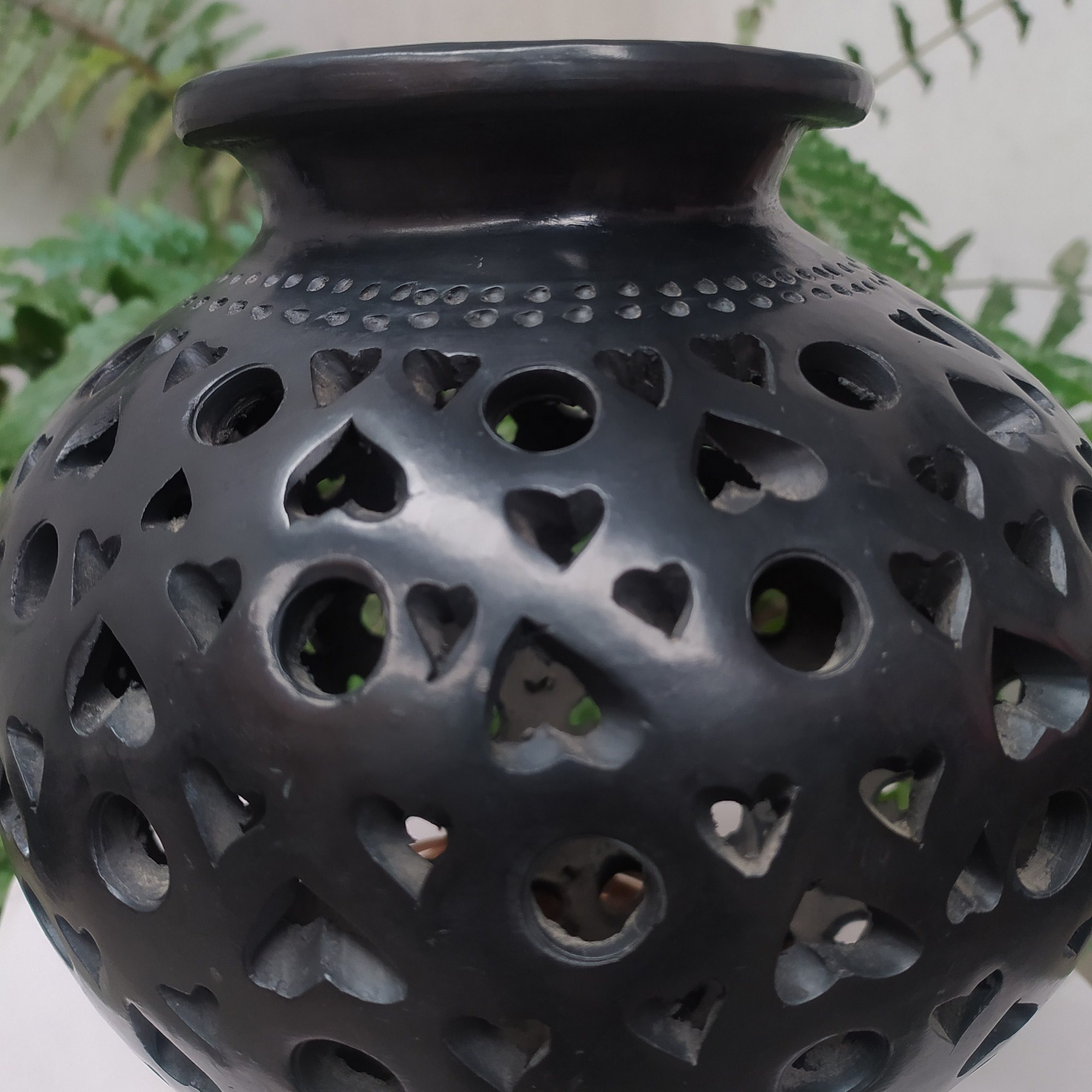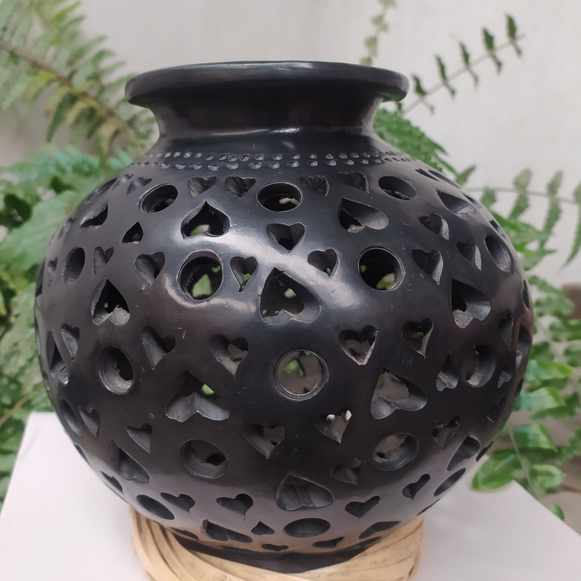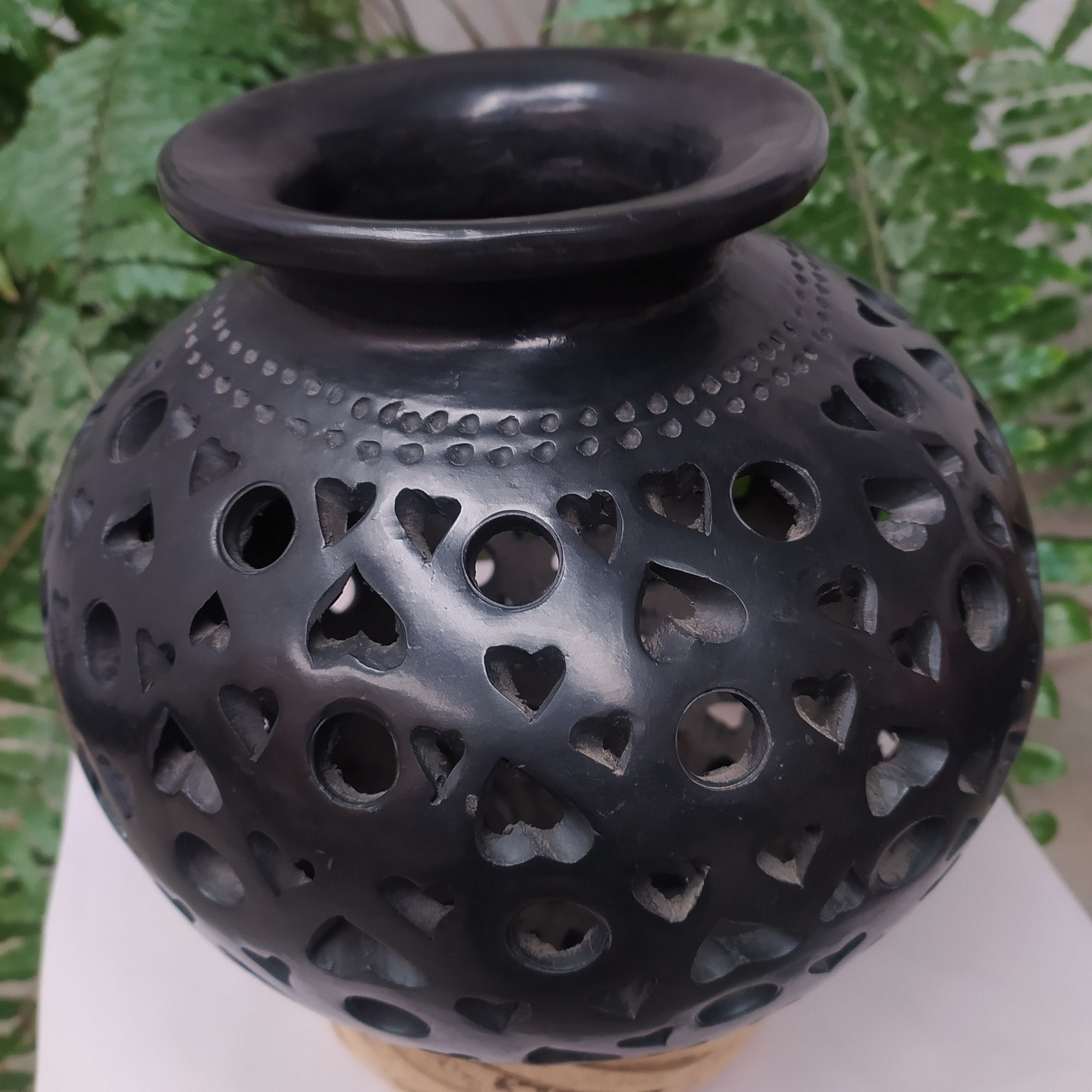 Cántaro calado completo de corazones y circulos grandes con franja de puntos en el cuello