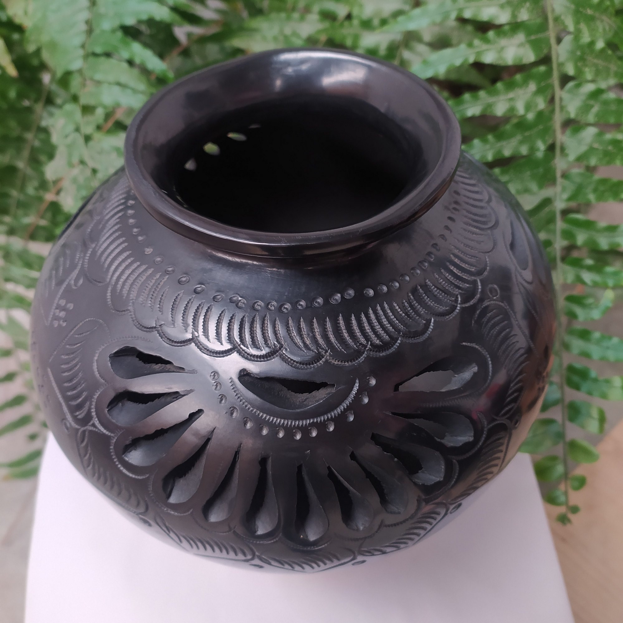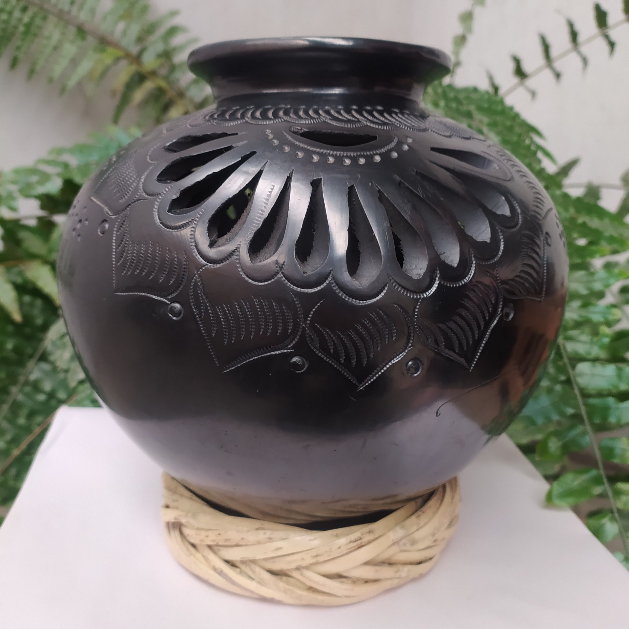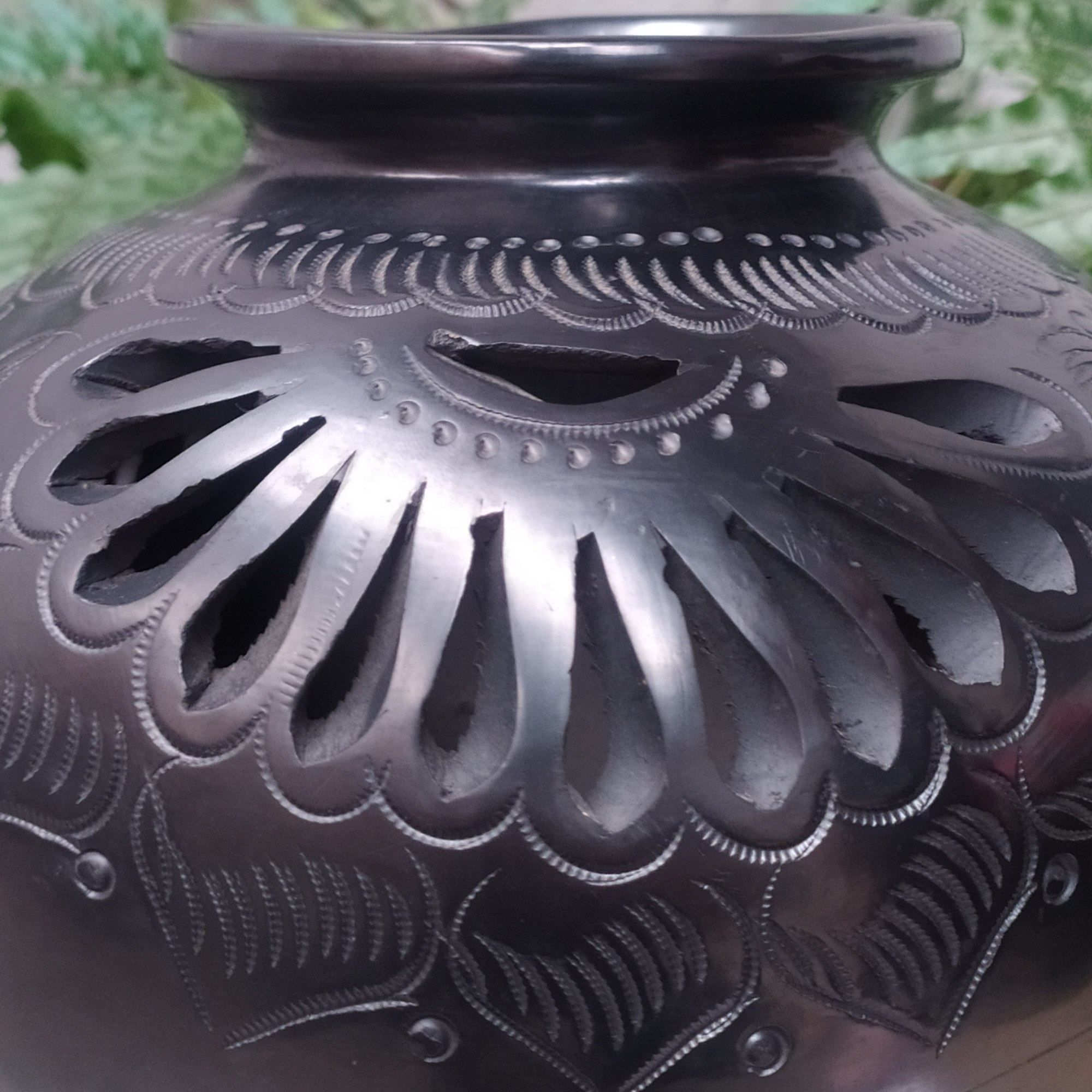 Cántaro nigua calado de flor con hojas caladas y grabadas con franja de lineas